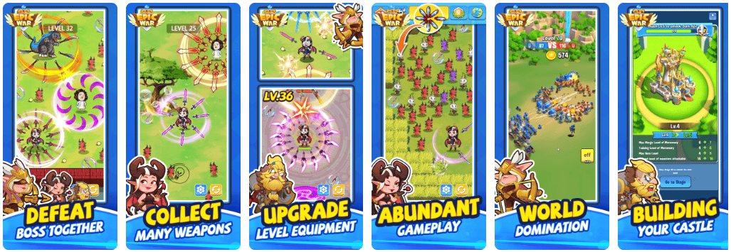 ,其中SLG游戏《Epic War》与《Titan War》、合成游戏《Merge Topia》、三国题材放置卡牌《Kingdom Go!》较为重要,尽管品类不同但他们产品的吸量逻辑都沿用了副玩法包装、高投放、全球发行的模版,短期成绩爆发不错,但均未达到头两款产品的高度。