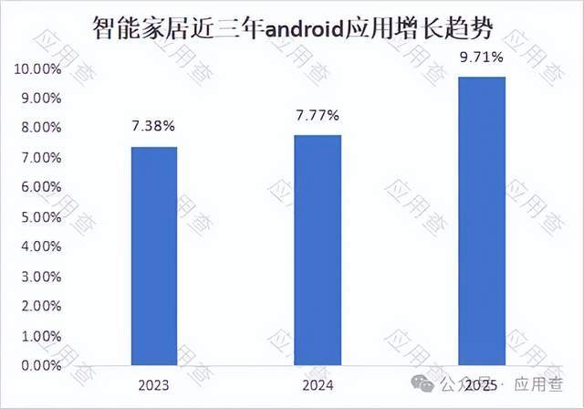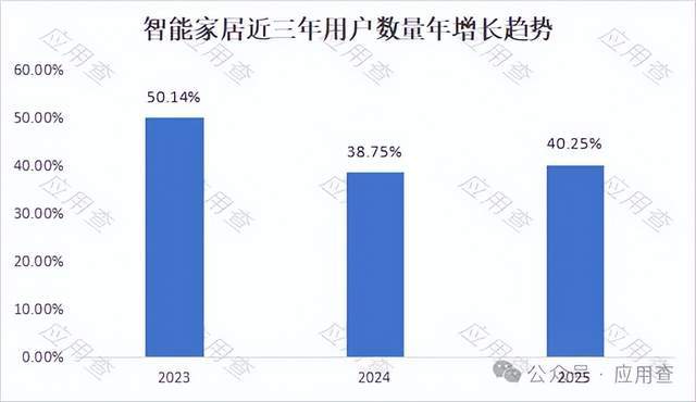 该行业2023-2025年Android应用持续增长,其反应智能家居硬件品类或整合生态的综合性智能家居App数量的新增。但应用数量增长个位数,但其关联的智能家居硬件市场表现增长势头强劲。随着5G与AIoT技术的成熟,未来趋势以头部企业AI全屋智能家居生态的“软硬结合“,及跨品牌生态综合性智能家居App为主。应用查-探究数字世界的企业线 智能家居移动用户增长趋势