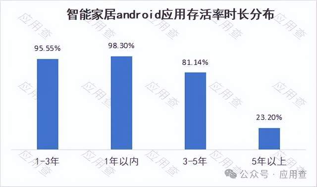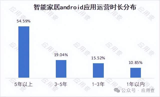 智能家居存在开发者/运营者的App运营时长分布数据,“5年以上”App占比超50%,大多企业以传统家电制造业为基础结合物联网的智能家居生态,如“西屋智能管家”App、“海信爱家”App。