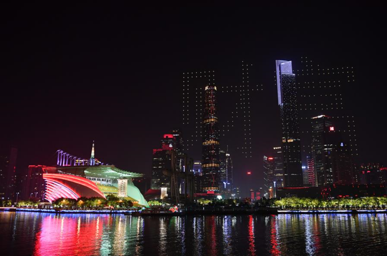 7日晚间,2017广州《财富》全球论坛欢迎酒会在广州塔举行。酒会尾声,在著名歌唱家廖昌永《致友人》的袅袅歌声中,1180架亿航无人机编队从海心沙次第起飞,直升入茫茫夜色中。随着歌曲高潮到来,1180架无人机同时闪亮,广州塔顿时亮如白昼,在空中形成的“财富”汉字、fortune等图案向远道而来的客人奉上最真挚的欢迎和祝福。