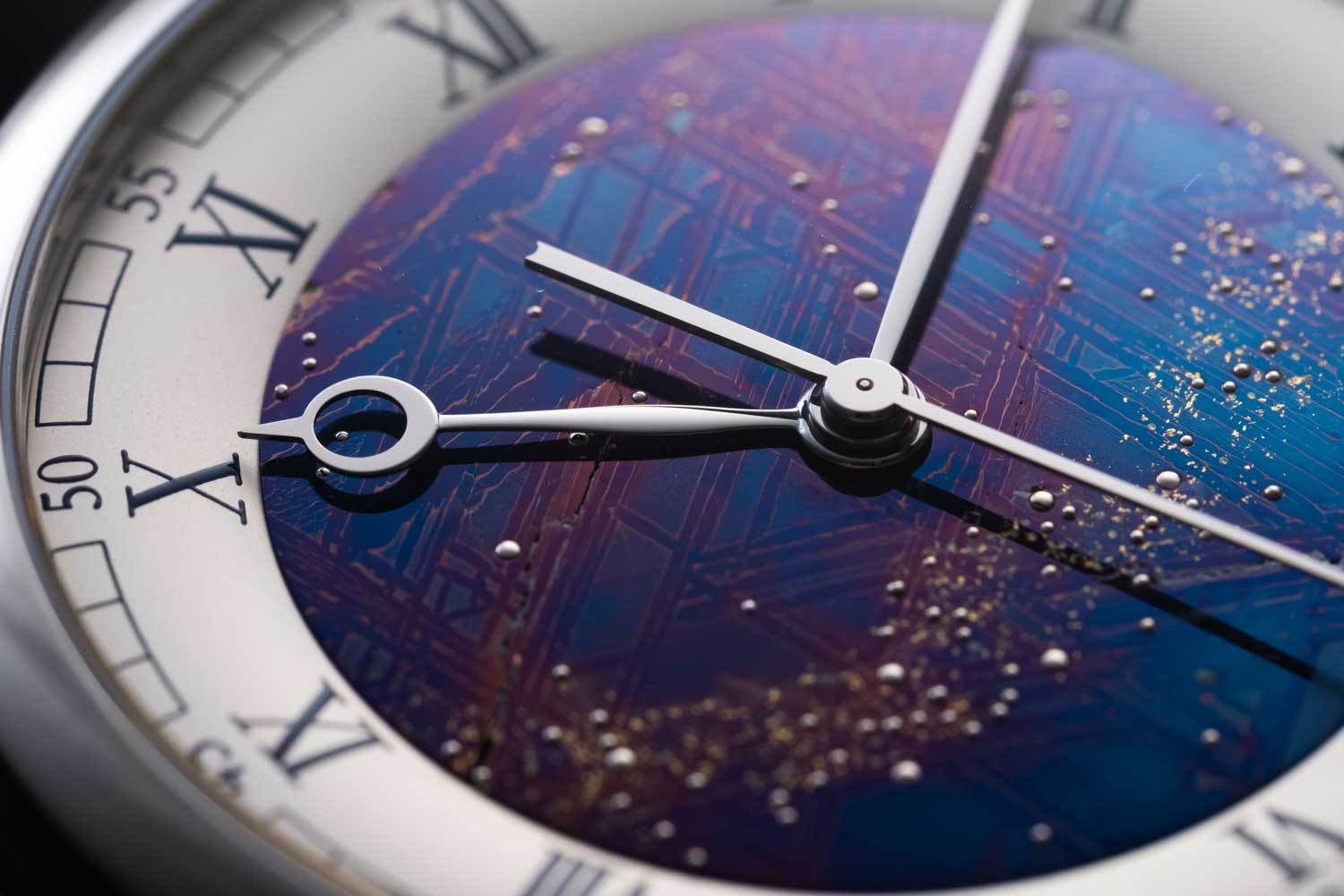 这颗陨石主要由铁和镍组成,切片时显示出以 60° 角交叉阴影线图案为特征的晶体结构,也称为 Widmannstätten 图案。表盘首先经过切片和酸蚀处理,然后进行热处理,产生类似于星云的蓝色紫色调。然后,手工将大量大小不一的白色金球体压入表盘上打孔的小孔中,描绘星星。它们散布在银河系中,这是浅激光雕刻的结果,然后被 24k 金箔覆盖。可以根据精确的天空图,在所需的日期、时间和地点定制星座的细节。