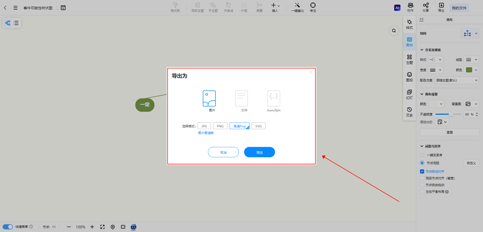 优化与导出:将树状图绘制完成之后,就可以点击页面右上角的【导出】按钮,将绘制好的树状图导出为想要的格式了。