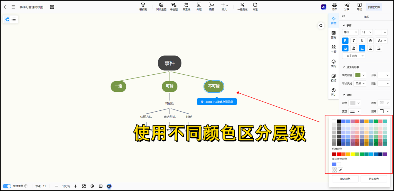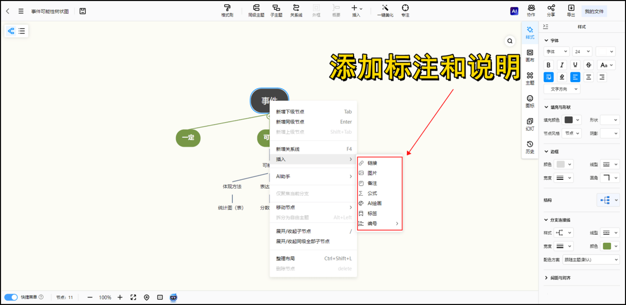 添加标注和说明:为了让读者更好地理解树状图,你可以在节点或线条上添加标注和说明。这些标注可以包括节点的名称、数据值、简要描述等。