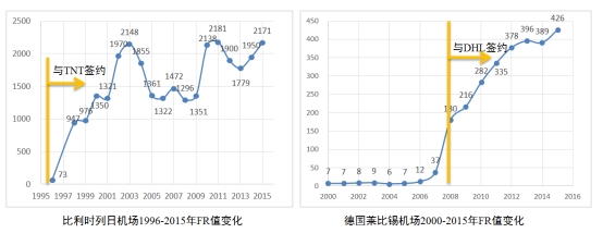 根据条件可判断,FR值大于100的机场依次是比利时列日机场、美国孟菲斯机场、美国路易斯维尔机场、美国安克雷奇机场、德国莱比锡机场、卢森堡机场、美国印第安纳波利斯机场、美国辛辛那提机场、美国安大略机场共9个,见表2-2。
