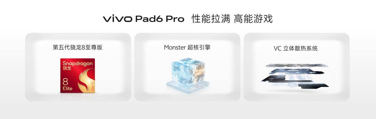 性能表现方面,vivo Pad6 Pro全面升级。其搭载第五代骁龙8至尊版,采用先进的3nm制程工艺,配合LPDDR5X高速内存和UFS 4.1疾速闪存,共同构建起强大的性能铁三角,轻松应对大型游戏、多任务并行等高负载场景。安兔兔综合跑分突破441万,刷新安卓平板性能上限。同时为保障高性能稳定输出,vivo Pad6 Pro上配备的VC和超导石墨散热总面积高达71446mm² ,相比上一代产品散热效率提升15%,为游戏与多任务等重载场景提供更稳定的性能支撑。