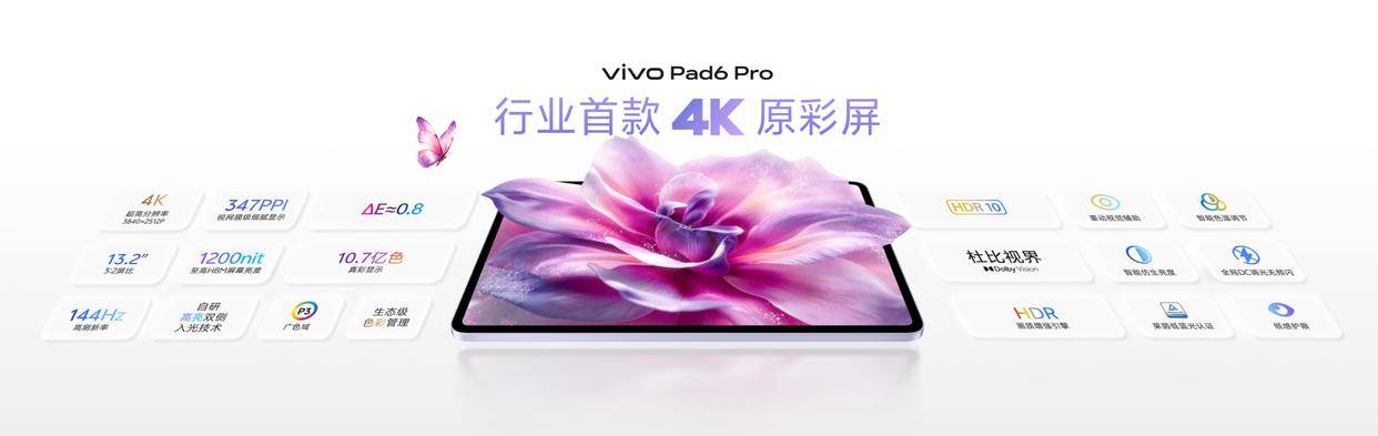 2026年3月30日,vivo正式推出新一代旗舰平板产品vivo Pad6 Pro,以全面进化的旗舰实力再度拓宽平板使用边界,推动安卓正式开启4K性能平板时代。其搭载行业领先的13.2英寸4K原彩屏,支持杜比视界,呈现更细腻、更真实的沉浸视觉体验;配合第五代骁龙8至尊版,实现性能跨越式升级;集成PC级WPS和剪映专业版,学习办公与创作表达高效合一。vivo Pad6 Pro在娱乐、移动办公等多元场景中,为用户带来更沉浸、更高效的旗舰级体验。